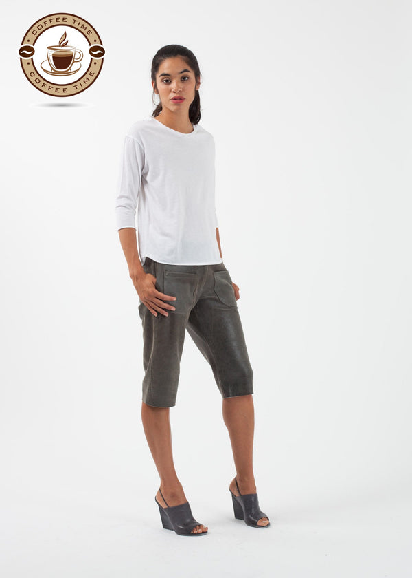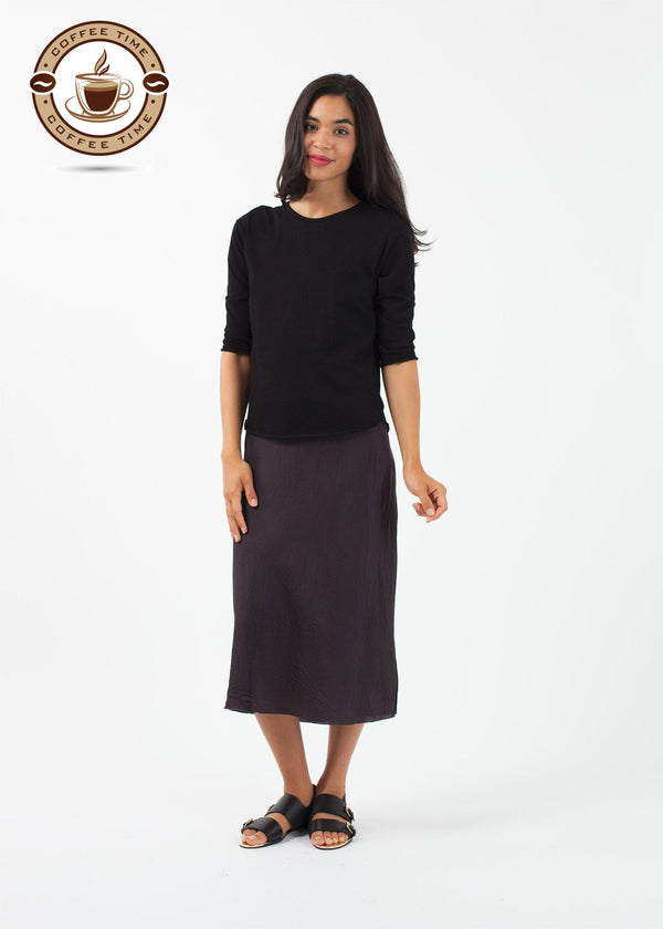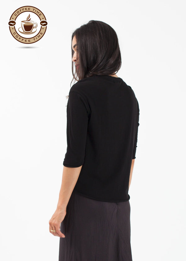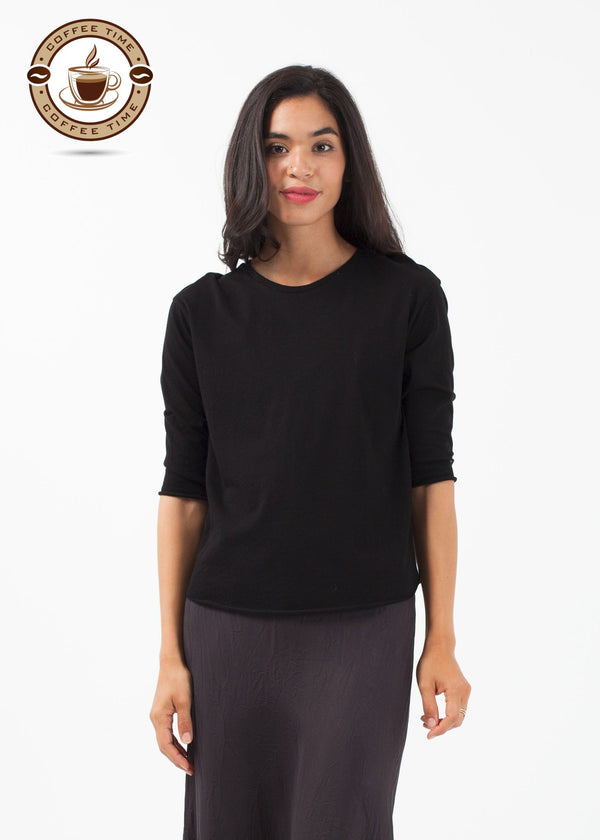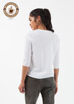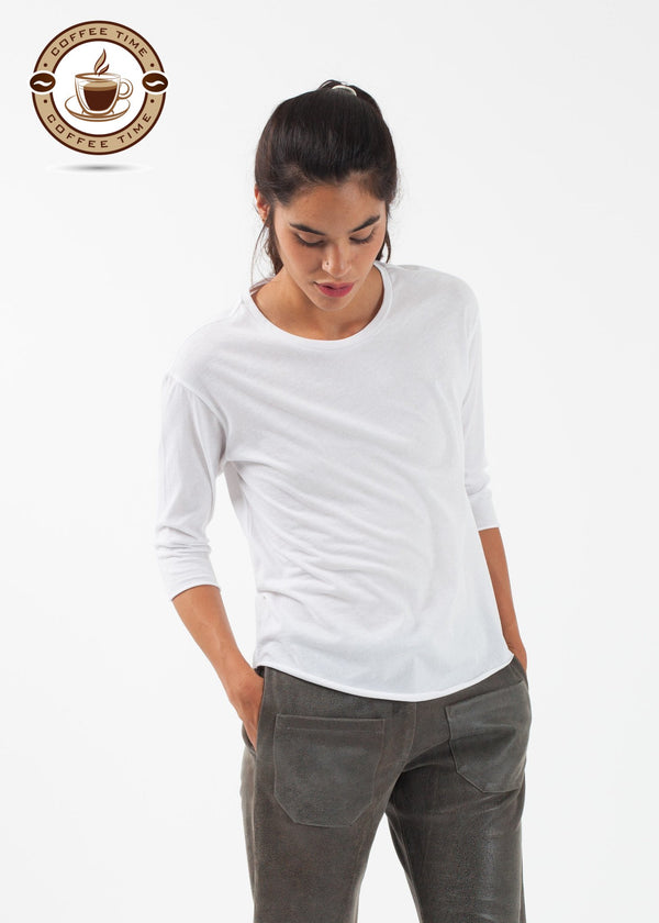 Pirouette into summer. The Ballet Top from Organic by John Patrick is highly versatile in a dreamy cotton. 3/4 inch sleeves. Raw hemming. 100% Organic Cotton. Made in Peru. Ashley is wearing an X-Small.