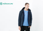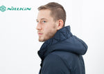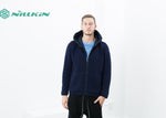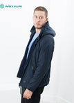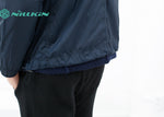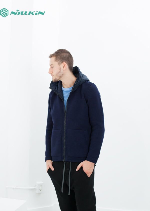 A fully reversible hooded jacket from Esemplaré whose motto is "For All of Us." A useful fabrication of warm knitted wool and water repellent nylon. It's your choice which side gets to see the world, either way it's got you covered. Full hood, two hand warmer pockets on either face with zip pockets on the nylon side. Drawstring cord at waist to keep in the heat. Color Midnight. 100% Wool, 100% Nylon. Matt is wearing a size Medium. Matt is 6’2”, Chest 38”, Waist 31”, Inseam 34.5”.