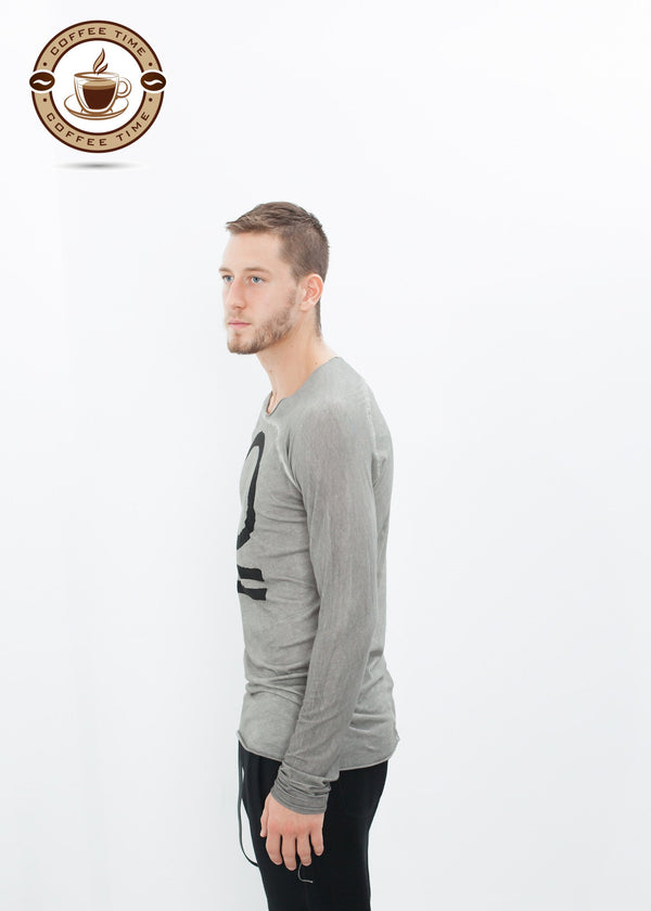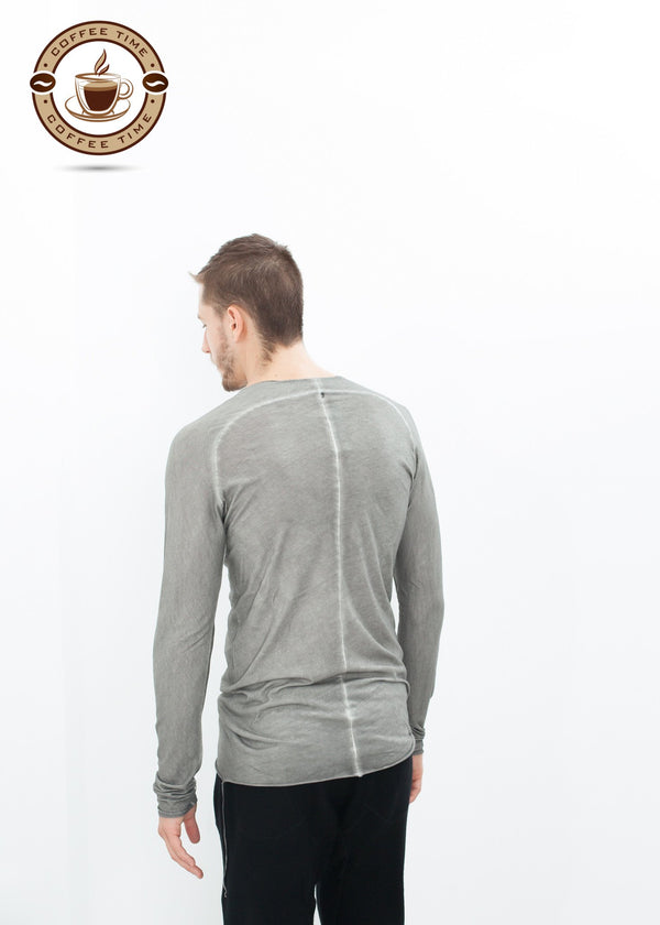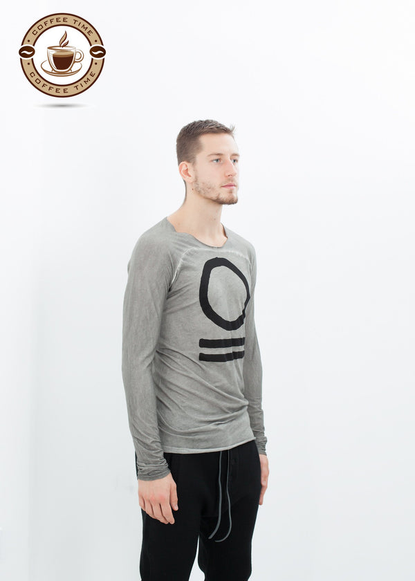 A long sleeved tissue tee featuring obscure artistry. Exposed seaming and unfinished edges gives this tee a worn effect. BLK OPM. Color Taupe. 100% Cotton. Matt is wearing a size Medium. Matt is 6’2”, Chest 38”, Waist 31”, Inseam 34.5”.