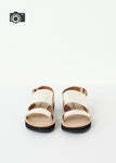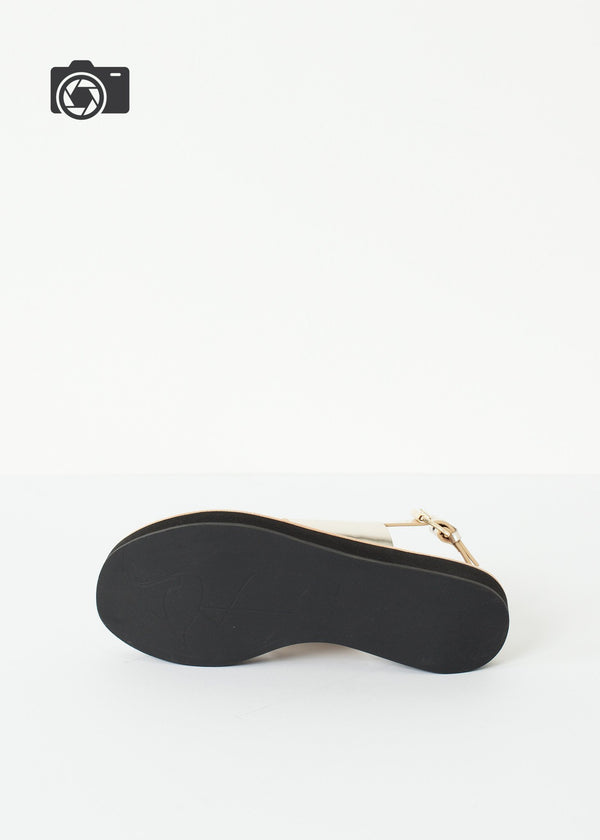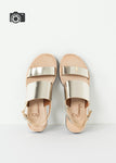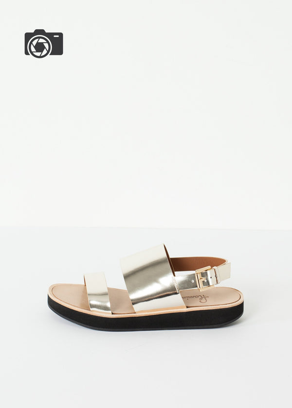 Fun straps paired with bright colors makes the French shoe label Flamingos perfect for summertime. With Anne Blum at its helm, this label effuses creativity in style and just the right amount of play. The Aqualina offers metallic straps for a bold statement. Buckle closure. Color Gold. 100% Calf leather upper, row cut, synthetic EVA sole. Leather lined. Made in Spain.
