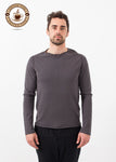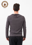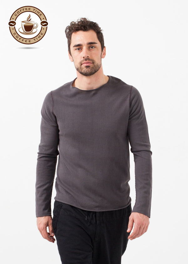 The Argon Sweater by Hannes Roether offers a lightweight, layer able piece for spring. Raw hems. Soft standup collar. Color Phantom. 100% Cotton. Made in Portugal. Jacob is wearing a Medium.