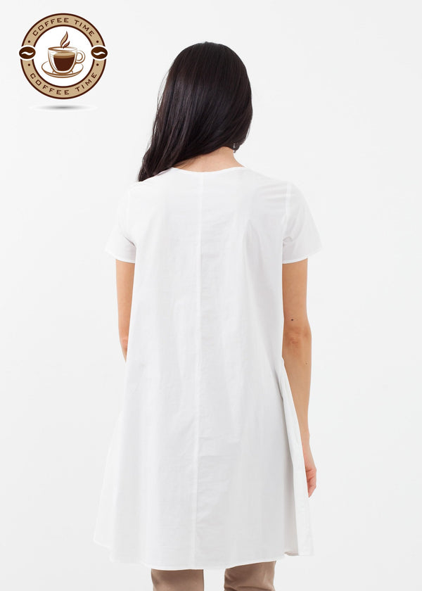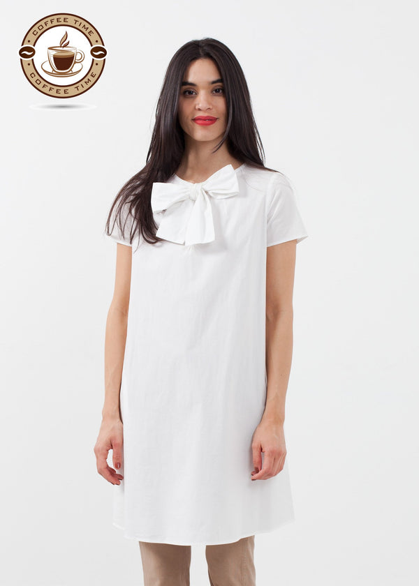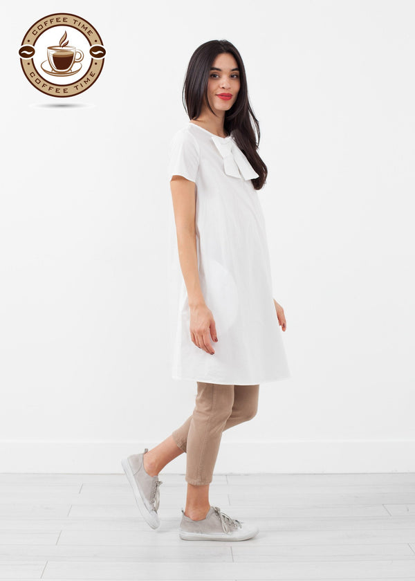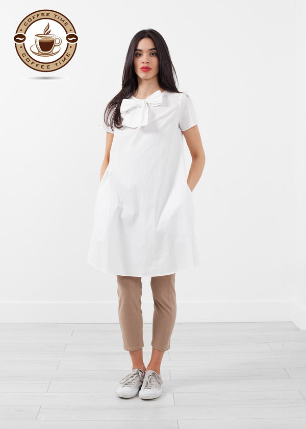 Manuela Arcari, designer of Hache and its sister brand TER ET BANTINE, approaches her second ready-to-wear line with a motive to create "perfect imperfections" within each collection. A myriad of references are blended for an off-center wardrobe. The Babydoll Dress ia delicately sweet for the summer season. Where a darling elegance comes out. Side angled pockets at front. Bow with snap button fastener at opening. Hook and eye closure at front. Color White. 96% Cotton, 4% Elastane. Made in Italy. Ashley is wearing a Size 40.
