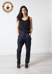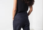 With just enough room to be "oversized," the Balan Pant from Hannes Roether makes functional comfort its priority. Back waist tie for adjustability. Drop crotch. Color Black. 100% Linen. Made in the EU. Ashley is wearing an X Small.