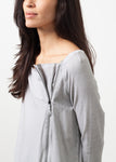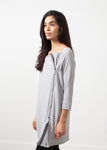 The Berry by Annette Gortz is part tunic, part knit top. 3/4 inch sleeves. Boat neckline. Side double zip at left front. Color Smoke. 92% Cotton, 8% Spandex, Trim 100% Cotton. Made in Germany. Ashley is wearing a Small.