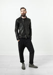 Made for the long ride, Giorgio Brato’s jackets encapsulate the brilliance of leather. This Distressed Motorcycle Jacket is perfect for those seeking adventure, and garments made to keep up. Zip closure at center front. Angled pockets at front. Fully lined. Color Black. 100% Leather, Sleeve Lining 100% Cotton, Body Lining 100% Linen. Made in Italy.
