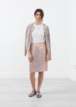 The softened color palette invokes feelings of a childhood summer, now long lost, but the memories remain. The Cox Skirt from Just in Case offers an iridescent-like glamour for this A-lined staple. Elastic waistband for ease. Front facing zip closure. Color Bronze. 100% Polyester. French Sizing.