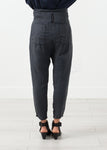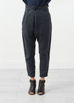 The Cross Trouser from Album di Famiglia offers a high waisted through drop-crotch fit of durable fibers. Single snap button closure at front. Side angled pockets at front, two exterior pockets at back. Color Charcoal. 100% Linen. Made in Italy. Ashley is wearing an X Small.
