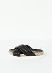 The Delano is a platform piece radiant for some summer sun. Statement straps contrast texture and color of the durable sole. Flamingos. Color Black. 100% Lambskin leather upper, Jute lined, synthetic EVA sole. Made in Spain.