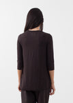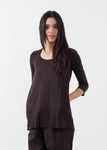 The Lietto Top is a heathered joy. This functional piece offers 3/4 inch sleeves, a scoop neckline, and raw hemline and cuffs. Labor.Art. Color Congo. 95% Linen, 5% Elastane. Made in Italy. Ashley is wearing a Size 0.