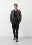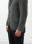 The Five Button Blazer is elegant, yet casual. Industrially strong fabrics combine in a classic silhouette makes a refined look. Button placket closure at center front. Three exterior pockets at front, two interior pockets. Lardini. Color Green. 100% Flax, Jacket Lining 100% Cotton, 60% Acetate, 40% Cotton. Made in Italy. Jacob is wearing a 50.