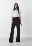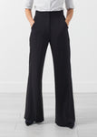 The Front Press Pant is a wide leg wonder. Beautifully shaped for a flattering silhouette. Hook and eye closure with fly zip at center front. Side angled pockets at front, one pocket at left back. Co. Color Black. 82% Triacetate, 18% Polyester. Ashley is wearing a Smalls