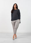 The Hamlet is a cozy pant with intentional wrinkling. Perfected beachwear for a seasonless look, these pants offer an elastic waistband for ease. Side angled pockets at front. Trim leg through the ankle. Manuelle Guibal. 100% Linen. Made in France. Ashley is wearing a Size 1.