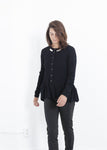 A fit and flare cardigan with just enough fit through the body that relaxes to become peplum-like at the hip. Made in Italy, this seven button cardigan has a metal trim detail at the collar and comes in grey or black wool. HIGH. Color Black. 55% Viscose, 25% Wool, 22% Polyamide. Lana is wearing a size Small.