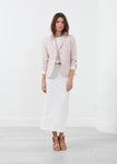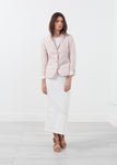 The Lavanda Blazer is an excellent springtime basic with its trim silhouette and soft color scheme. Two button placket closure at front. Two exterior pockets at front. Lining. Lardini. Color Pink. 38% Flax, 32% Viscose, 30% Cotton, Lining 70% Acetate, 30% P.B. Elite. Made in Italy. Lana is wearing the Italian 38.
