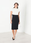 Hand crafted from concept to finished product, this Columbian label is authentically kind and creative. Distinctive layering cape of silk and crepe wool with caped sleeves. Tie and zip closure with back paneling. Amelia Toro. Color Cream/Black. 100% Crepe Wool Body, 100% Silk Bodice. Made in Columbia. Lana is wearing a Size 2.