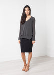 Become enchanted with the Liberty by Lareida. Graceful draping of form guides to its' hinted sensuality. Soft v-neckline, tailored sleeves, and flowing layered hem. Single button closure at center back. Color Asphalt. 92% Silk, 8% Lycra. Made in Portugal. Ashley is wearing a 36.