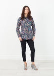 Floral all over, this blouse ignites springtime joys. Tailored to slim fit. Feminine, soft Peter Pan collar. Single button front placket. Tapered cuffs. Back yoke. Harvey Faircloth. Color Black/Floral. 100% Cotton. Made in U.S.A. Lana is wearing a size 2.