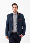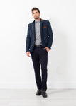 The Milton invites a lumberjack appeal for luxury men's suiting. Leather adjustable collar detail. Button placket closure with zip at front. Four exterior pockets at front. Fully lined. Circle of Gentlemen. Color Navy. 96% Polyamide, 4% Elastane, Lining 100% Viscose. Made in Portugal. Jacob is wearing a 48.