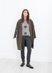 A slim pant with a fantastic shape thanks to seaming details running down front and back. A thick wool and poly blend that recovers quickly. No Pockets to disrupt the perfect line. Belt loops and a nylon zipper fly. Annette Gortz. Color Stone. 55% Wool, 40% Polyamide, 5% Elastane. Made in Germany. Lana is wearing a German 36.