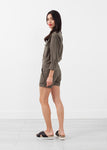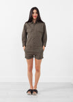 The Officers Jumper presents a feminine army casual. Double breasted exterior flap pockets and side angled pockets at front. Button down placket with button fly. 3/4 inch sleeves. NLST. Color Olive. 100% Cotton. Ashley is wearing an X-Small.