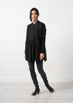 The Oversized Bibbed Blouse combined earthy with some elegance. Mandarin collar, tuxedo front button placket, contrasting sleeves, and tunic-like shape, this tops adds much needed diversity to our winter wardrobes. Embrace this top, thaw, and rejoice. Sibel Saral. Color Black. 100% Cotton, 96% Cotton, 4% Elastane. Made in Italy. Ashley is wearing a Size 0.