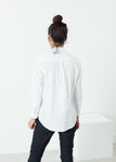 A crisp and clean white button-up with pointed collar. A slim navy cotton tie is attached smartly using the existing placket buttons. We like the suggestion to wear a tie, and also appreciate the versatility of taking it off. Sibel Saral. Color White. 100% Cotton. Ashley is wearing an Extra-Small.