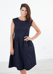Throughout the seasons Ter et Bantine has made this plain-woven blue and black fabric a signature applied to many silhouettes. We find this fit and flare A-line dress with pieced pattern work and a flattering dart placement a fine iteration of the signature. An invisible zip lays flat at the spine. Color Dark Navy. 72% Polyester, 13% Acrylic.