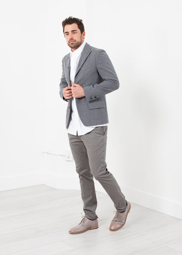 The Pools incorporates a unique micro pattern in the modern silhouette. Hook and eye closure with single button and button fly at front. Four exterior pockets. Pence. Color Grey Stripe. 100% Cotton. Made in Romania. Jacob is wearing a Size 48.