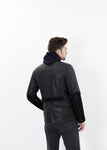 A classically styled field jacket is cut with a roomy fit and updated in supple goatskin leather for a vintage look and feel. This coat features a hidden zipper and button placket, buckle at neck and multiple flap patch pockets at the front. The back has a grey topstitched yoke and vented hem. Topstitching is seen throughout the jacket. Handstich. Color Meteor. 100% Goatskin, Lining 100% Polyester. Made in Germany. Spencer is wearing an Italian 50.