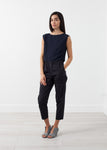 The Relaxed Trouser seduces the mind into a comfortable luxury rare in pant-wear. Easy elastic waistband. Oversized to tapered leg. Side angled pockets at front. Rollable hem with single button closures. Sayaka Davis. Color Grey. 100% Cotton. Made in U.S.A. Ashley is wearing a Size 2.