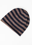 A versatile striped beanie is upturned to reveal an abstract pattern. Epice. Colors Amber. 100% Wool. One Size.
