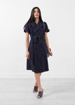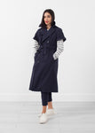 The Trenchcoat presents a feminine army casual as a overcoat or statement dress. Double button closure at front. Adjustable belt at waistband. Side angled pockets at front. NLST. Color Navy. 100% Cotton. Ashley is wearing an X-Small.