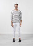 The Sergio Pant is a straight leg with a clean look. Five button fly closure at front. Four exterior pockets. Homecore. Color White. 100% Cotton. Made in Portugal. Matt is wearing a Size 30. Matt is 6’2”, Chest 38”, Waist 31”, Inseam 34.5”.