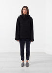 Unisex outer-layer to keep you warm and dry. Three button placket at front. Two exterior button pockets. Drawstring waistband. Adjustable hood. Hansen. Color Black. 100% Cotton. Made in EU. Lana is wearing an XSmall.