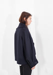 Embracing balance and asymmetry in stride, an intentionally slouched crop jacket takes on military influences with a notched shawl collar, belted cuffs and epaulettes positioned at the shoulders. The generous ballooning sleeves allow for your warmest sweater underneath. Gianfranco Scotti. Color Navy. 57% Viscose, 40% Polyamide. Lana is wearing a French 36.