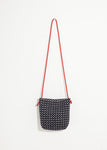A mini wool cross-body pouch with a red corded strap looped through metal grommets lends a conveniently laid back style. An inner pocket and covered button and loop closure complete this casual hip accessory. Color Black/White. 80% Wool, 20% Rayon, Lining 65% Acetate, 29% Polyamide. Made in U.S.A.